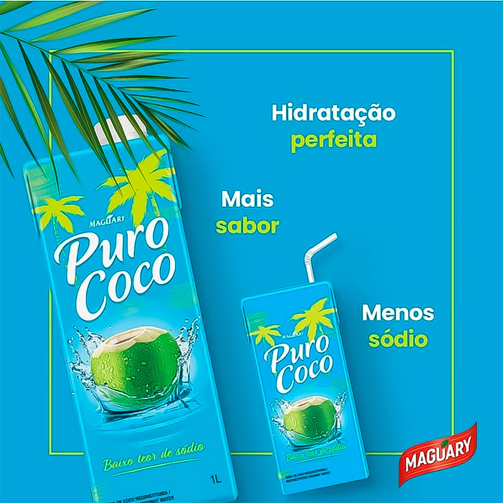 Ingredientes: Água potável, água de coco concentrada, sacarose (0,5% para padronização do produto), acidulante: ÁCido cítrico e antioxidantes: Ácido ascórbico e metabissulfito de sódio.