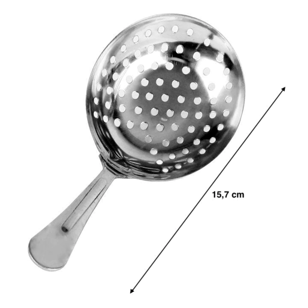 O Coador para Coquetéis Julep em Inox é um acessório essencial para bartenders e amantes da coquetelaria. Feito em aço inoxidável de alta qualidade, possui um design clássico e funcional que permite coar bebidas com precisão, evitando a passagem de ingredientes sólidos para o copo. Ideal para a preparação de drinks como o Mint Julep e outros coquetéis, garantindo um preparo profissional e sofisticado.