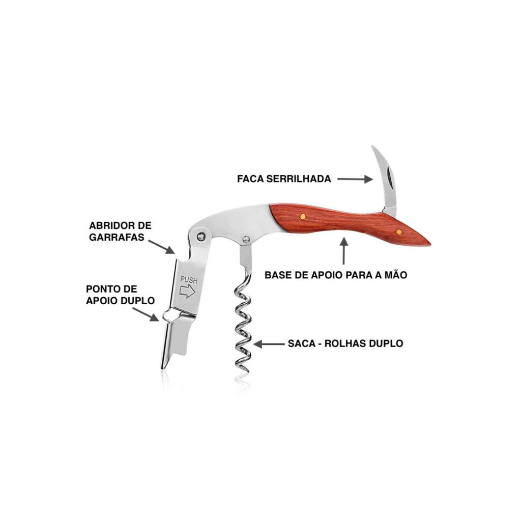 Item da embalagem: 1 unidade - Saca Rolha em Inox Dois Estágios com Cabo de Madeira